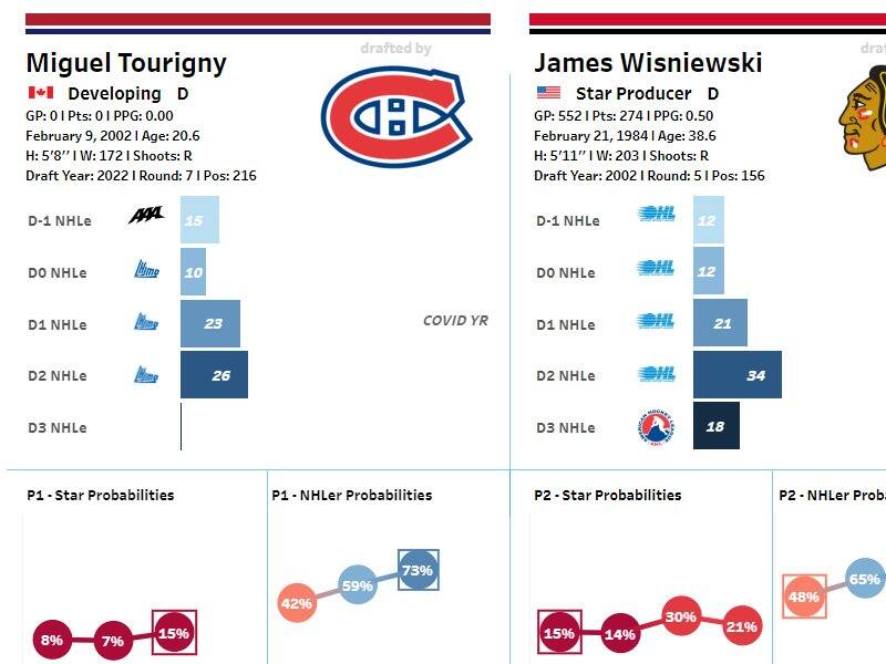 «L’année de son repêchage, il a été bon, mais pas extraordinaire. Ensuite, il a pris son envol l’année d’après. Mais c’est vraiment lors de la deuxième saison suivant son année de repêchage qu’il est sorti du lot avec une équivalence LNH très élevée et anormale. Statistiquement, il ressemble à James Wisniewsky.»