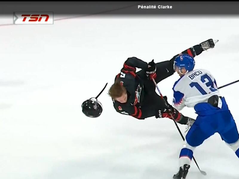 En deuxième période du match quart de finale opposant l’Unifolié à la Slovaquie, l’attaquant Robert Baco a servi à l’arrière canadien une percutante mise en échec. La force de l’impact a envoyé valser le casque de Clarke, dont la tête s’est alors retrouvée sans protection.