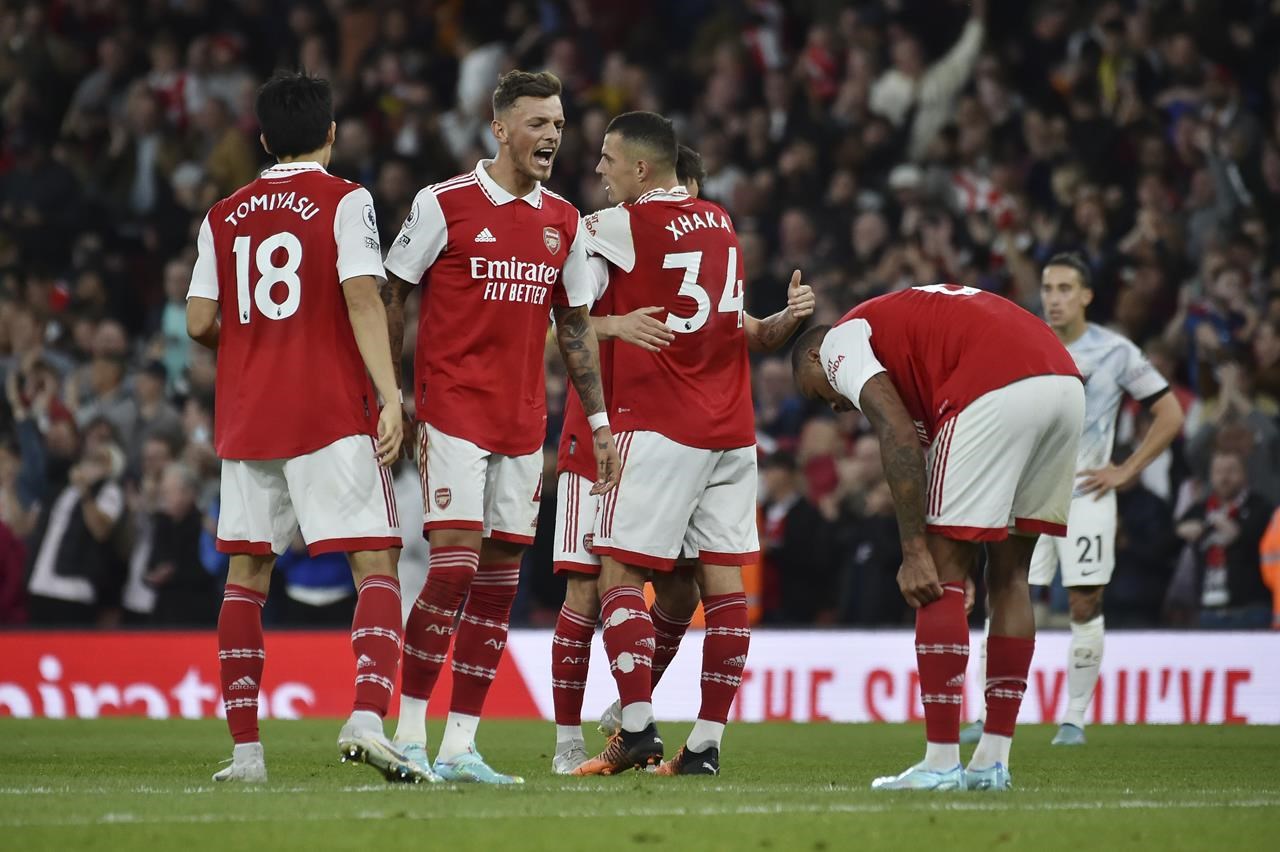 Les joueurs d’Arsenal célèbrent après avoir remporté le match de football de Premier League anglaise entre Arsenal et Liverpool à l’Emirates Stadium de Londres, dimanche 9 octobre 2022. Arsenal a gagné 3-2.