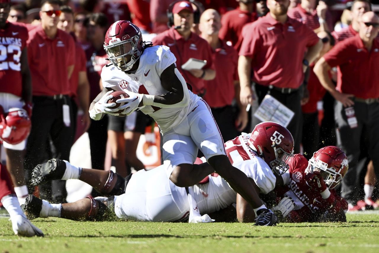 Le running back de l’Alabama Jahmyr Gibbs (1) porte contre Arkansas pendant la première mi-temps d’un match de football universitaire NCAA samedi, oct. 1, 2022, à Fayetteville, Ark.