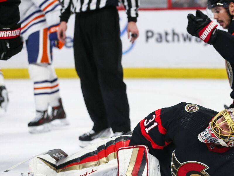 Le gardien des Sénateurs Anton Forsberg a subi une blessure vraisemblablement à la jambe droite, samedi contre les Oilers, et a dû être transporté à l’extérieur de la patinoire sur une civière.