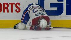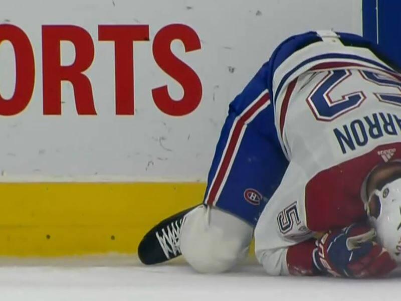 Le défenseur des Canadiens de Montréal Justin Barron a été sonné par l’attaquant des Hurricanes de la Caroline Andrei Svechnikov, jeudi soir.