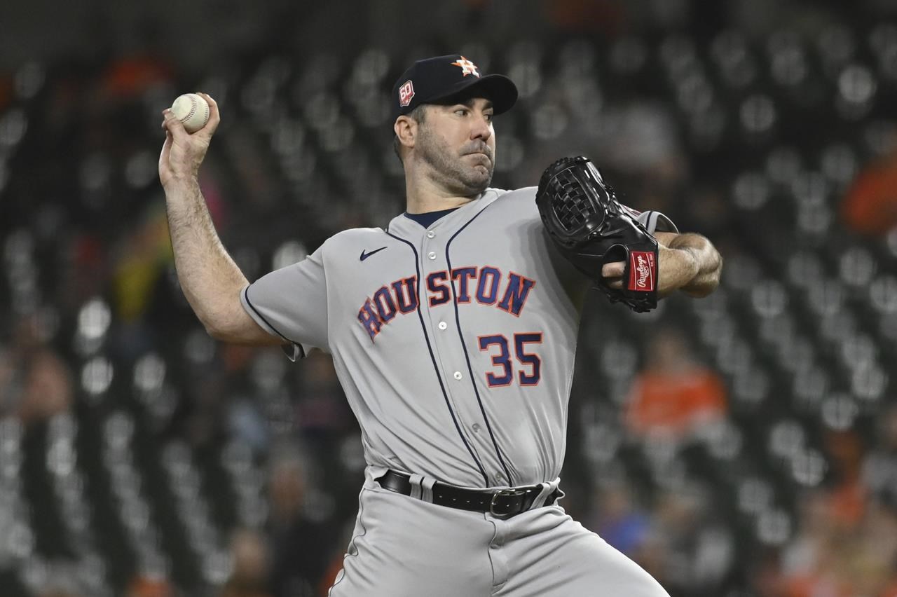 Le lanceur partant des Astros de Houston Justin Verlander (35) lance à un batteur des Orioles de Baltimore pendant la cinquième manche d’un match de baseball, jeudi 22 septembre 2022, à Baltimore. 22, 2022, à Baltimore.
