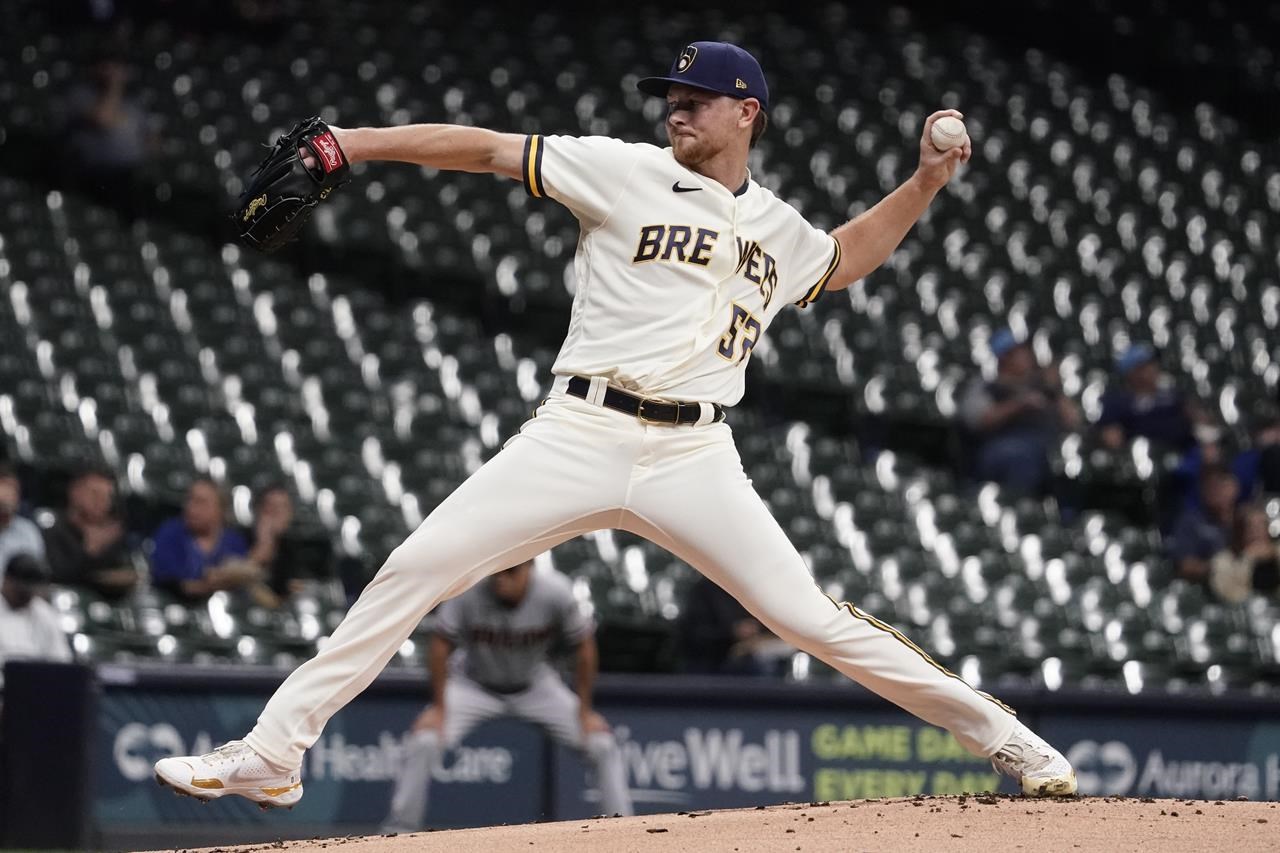 Le lanceur partant des Brewers de Milwaukee Eric Lauer lance pendant la première manche d’un match de baseball contre les Diamondbacks de l’Arizona, mardi 4 octobre 2022, à Milwaukee.