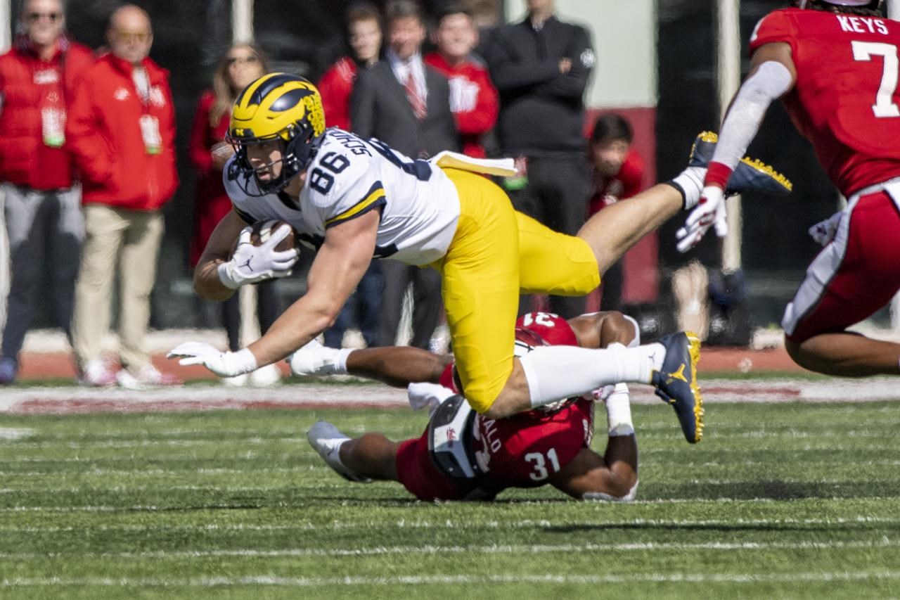 BLOOMINGTON, Ind. (AP) – La réception d’un touchdown de 29 yards par Cornelius Johnson au milieu du troisième quart-temps samedi a donné au Michigan n°4 l’avance et le coup de fouet dont il avait besoin pour se détacher d’Indiana 31-10 dans un match émouvant au cours duquel un entraîneur des Wolverines a été transporté à l’hôpital.