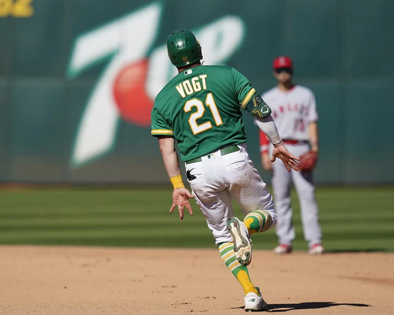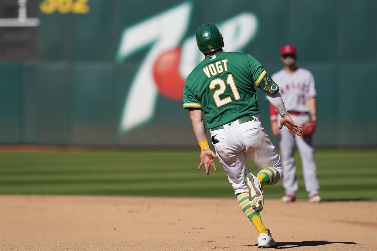 Stephen Vogt des Athletics d’Oakland court les bases après avoir frappé un home run en solo contre les Angels de Los Angeles pendant la septième manche d’un match de baseball à Oakland, en Californie, Mercredi 5 octobre 2022.