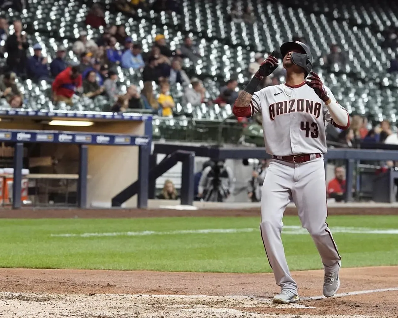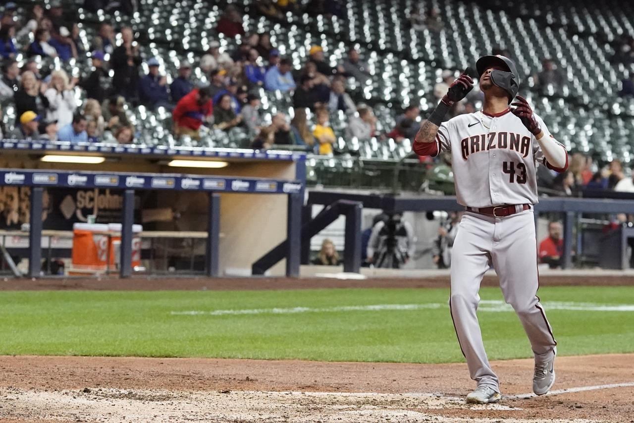 Sergio Alcantara, des Diamondbacks d’Arizona, réagit après avoir frappé un home run de deux coups lors de la septième manche d’un match de baseball contre les Brewers de Milwaukee, lundi 3 octobre 2022, à Milwaukee.