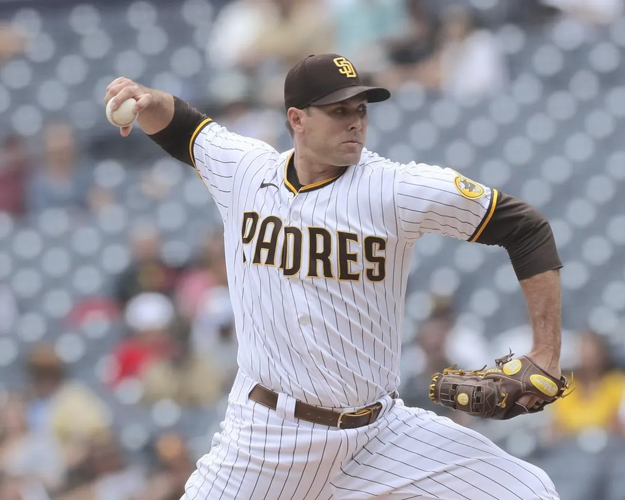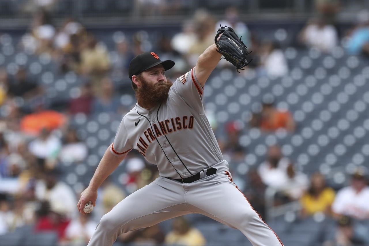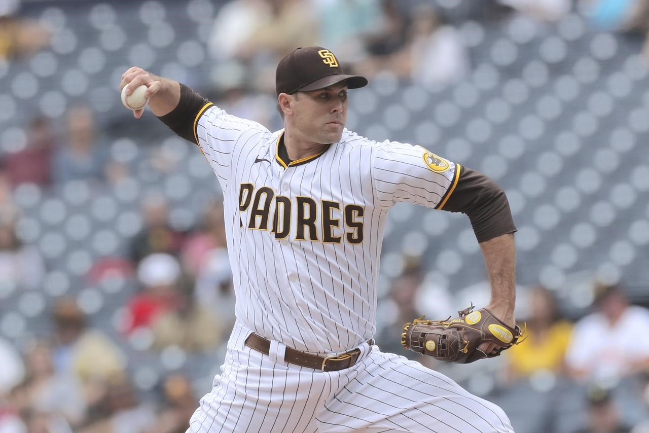Le lanceur partant Craig Stammen des Padres de San Diego s’enroule contre les Giants de San Francisco lors de la première manche d’un match de baseball, mercredi 5 octobre 2022, à San Diego.