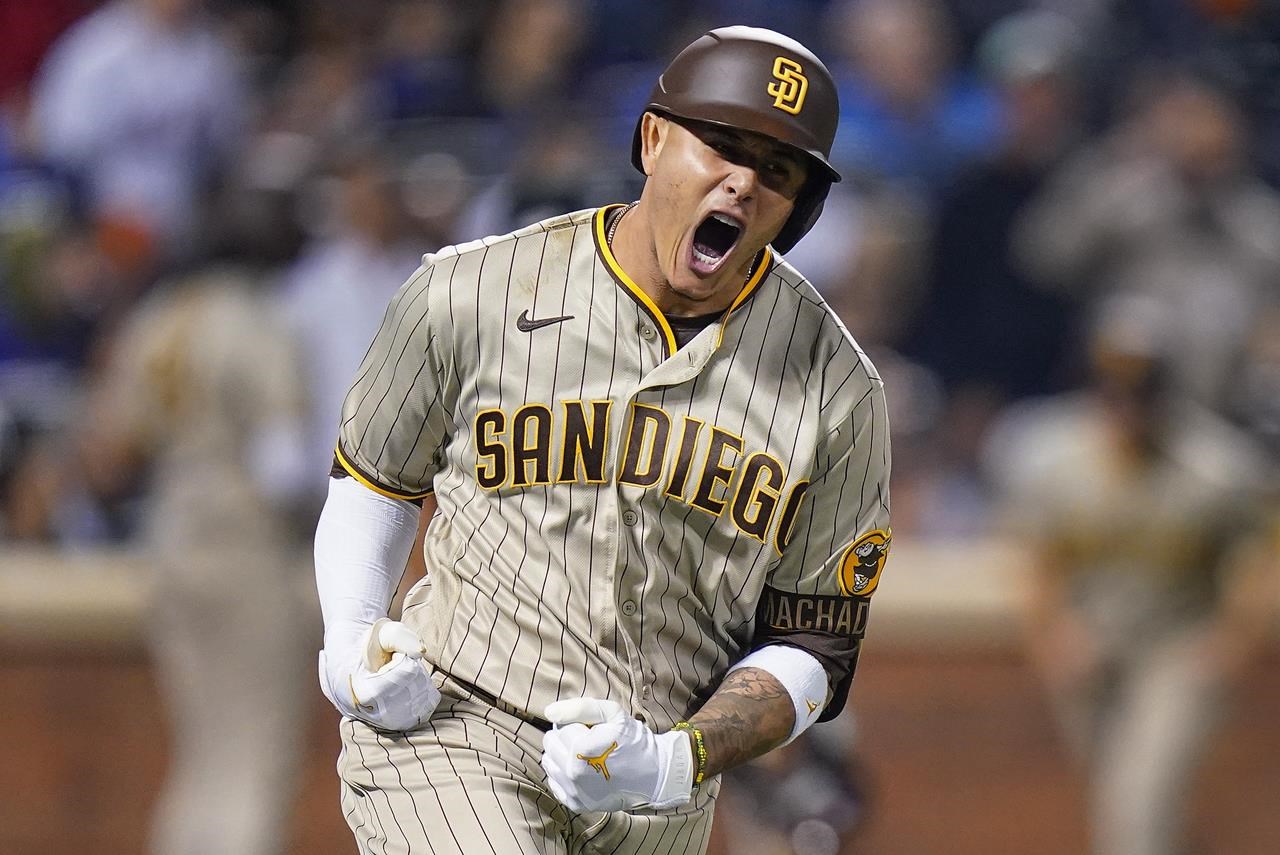 San Diego Padres Manny Machado réagit en faisant le tour des bases après avoir frappé un coup de circuit solo contre les Mets de New York pendant la cinquième manche du match 1 d’une série éliminatoire de la National League wild-card baseball, vendredi, oct. 7, 2022, à New York.