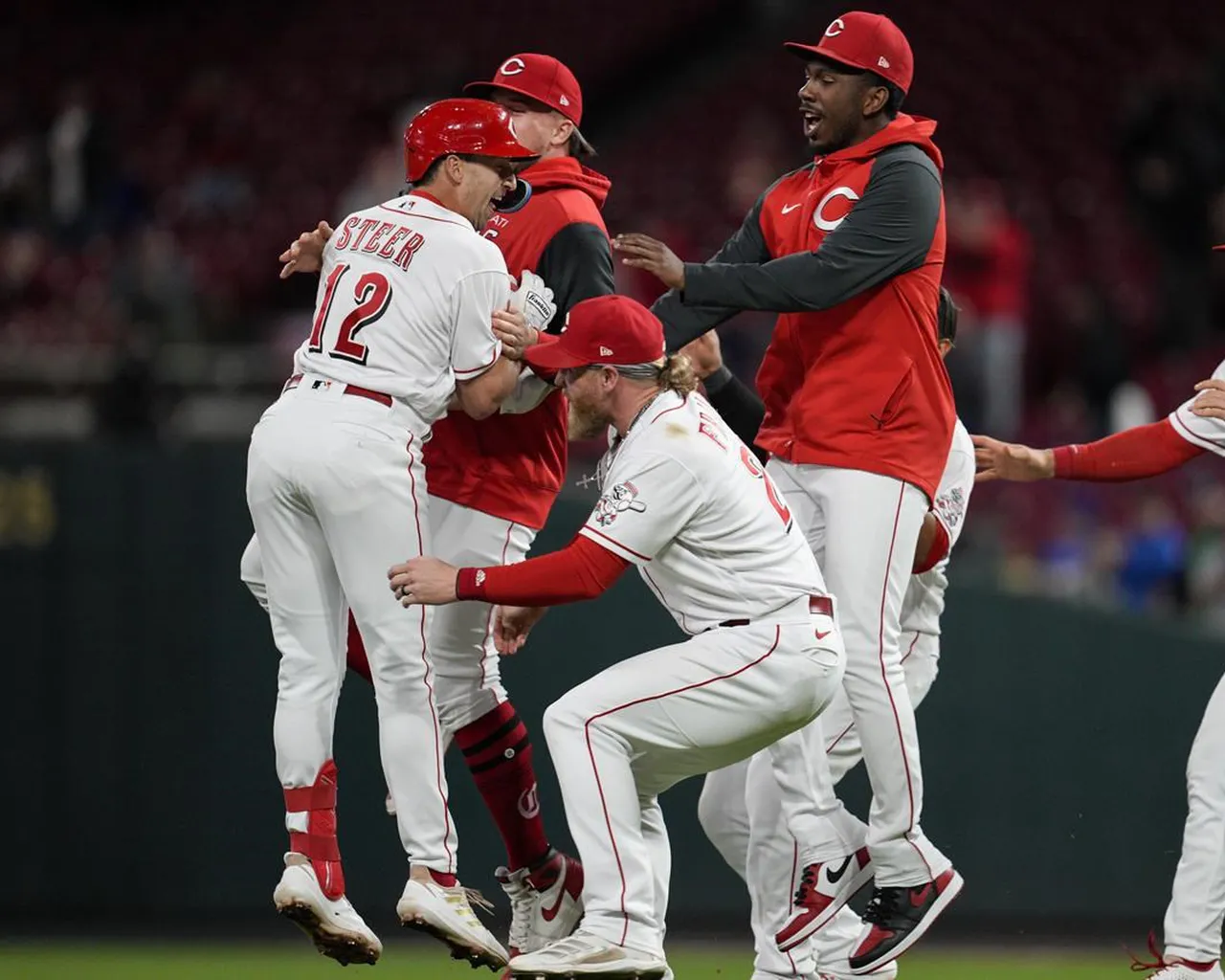 Spencer Steer (12) des Reds de Cincinnati célèbre avec ses coéquipiers après avoir frappé le double RBI gagnant du match dans la neuvième manche d’un match de baseball contre les Cubs de Chicago, mardi 4 oct.