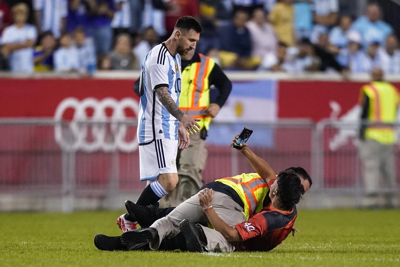 Un fan a sprinté sur le terrain à la 65e minute et a été rapidement renversé et entouré par la sécurité lorsqu’il s’est approché de Messi, qui est resté debout et a regardé le spectateur maîtrisé à ses pieds et qui essayait encore de prendre une photo.