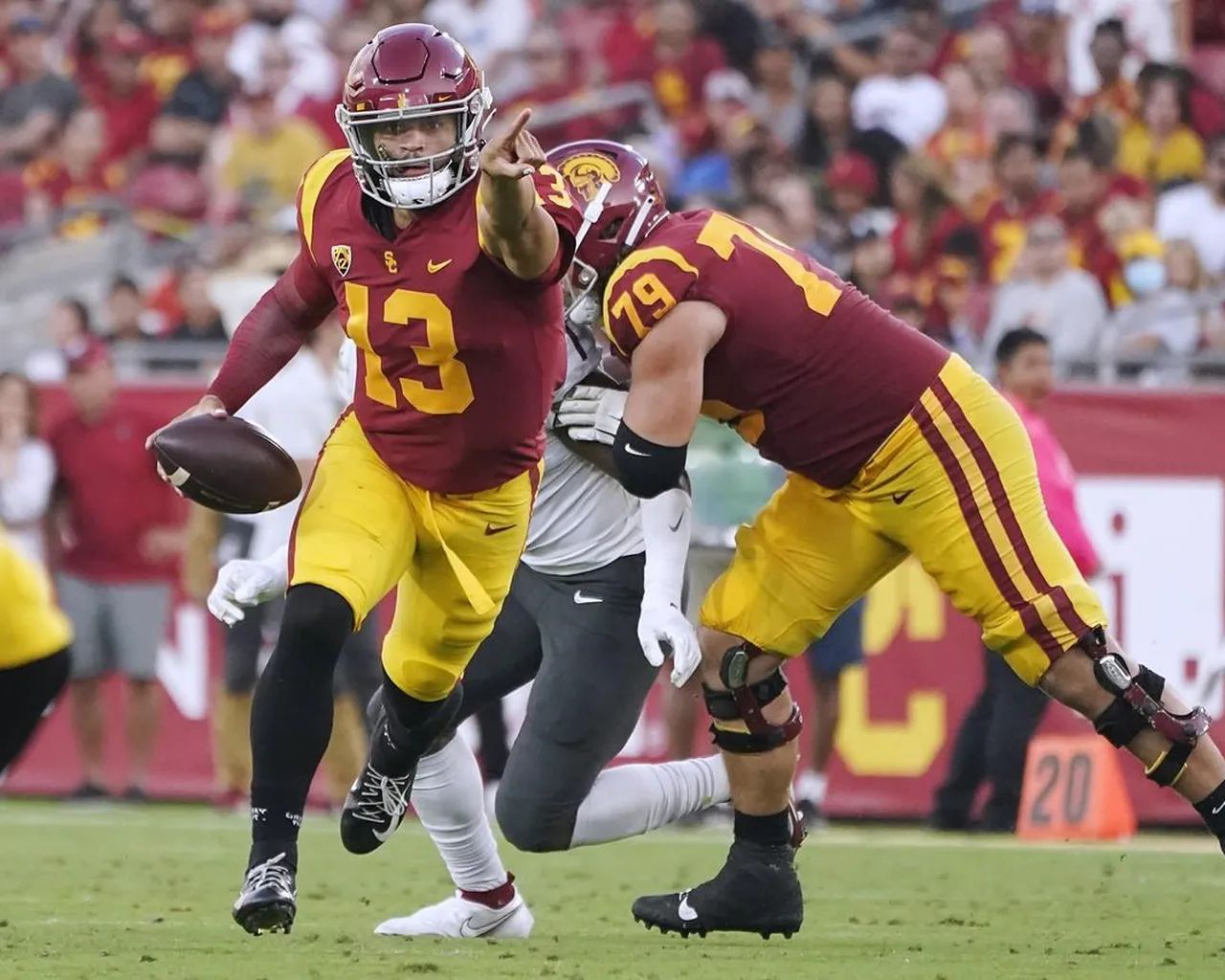 L’USC a même persévéré malgré l’absence de deux leaders défensifs : Le meilleur linebacker Shane Lee est resté sur le banc en raison d’une blessure, et le meilleur safety Calen Bullock a été éjecté sur une décision de ciblage décidée par contrôle vidéo dans le deuxième quart-temps.
