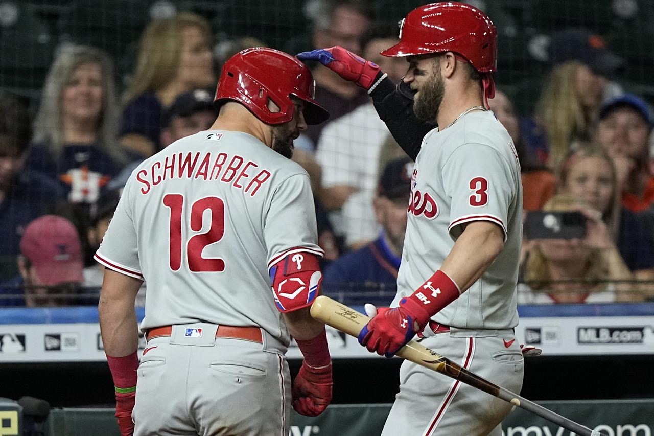 Kyle Schwarber (12) des Phillies de Philadelphie est félicité par Bryce Harper (3) après avoir frappé un home run contre les Astros de Houston pendant la huitième manche d’un match de baseball, lundi 3 octobre 2022, à Houston.