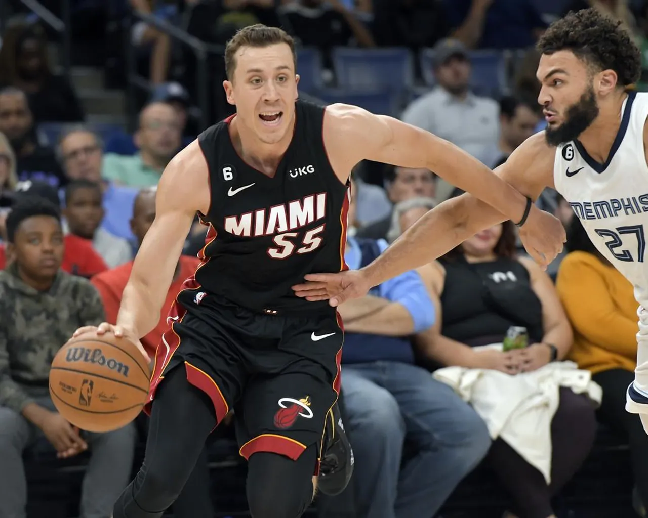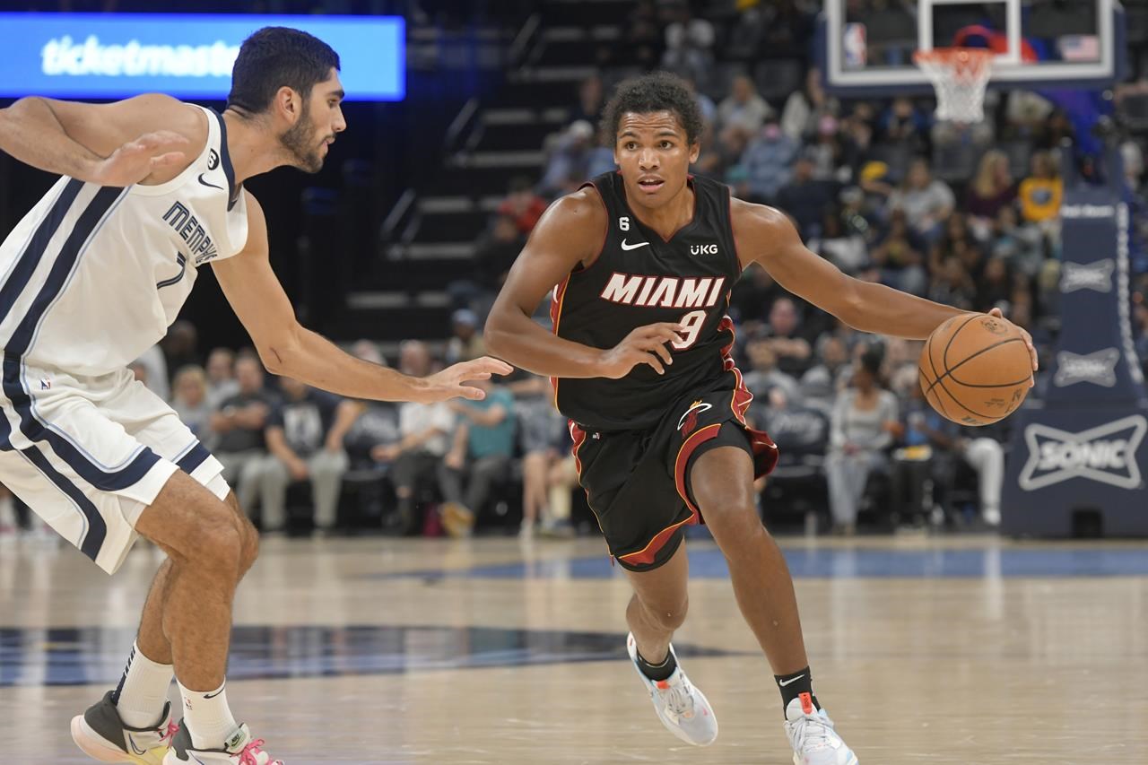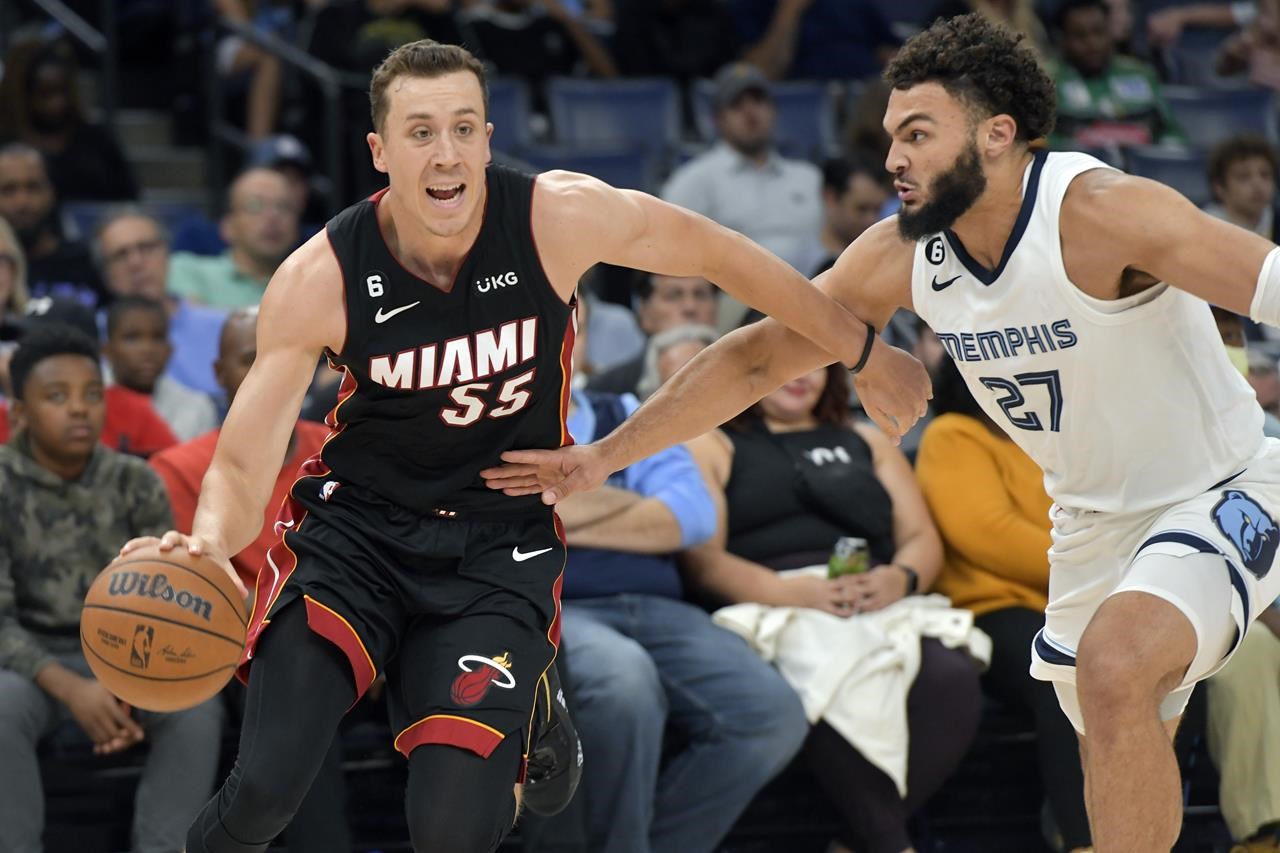 Le gardien du Miami Heat Duncan Robinson (55) manipule le ballon contre l’attaquant des Memphis Grizzlies David Roddy (27) lors de la première mi-temps d’un match de basket-ball de présaison de la NBA, vendredi 7 octobre 2022, à Memphis, Tenn.