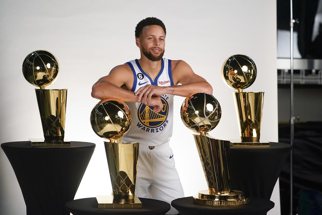 SAN FRANCISCO (AP) – Les baskets “Sour Patch” aux couleurs vives de Stephen Curry ont grincé bruyamment pour annoncer son arrivée à la journée des médias. Il a ensuite pris place, rentré son maillot emblématique n°30 et posé avec tout son matériel de champion.