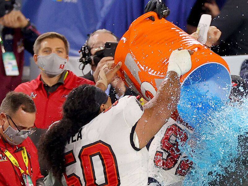 Lors des deux derniers duels – les triomphes des Rams de Los Angeles et des Buccaneers de Tampa Bay – c’est un liquide de couleur bleue qui a été versé lors des célébrations. Or, en 2020, lors de la victoire des Chiefs de Kansas City, Andy Reid avait été trempé par un breuvage orange.