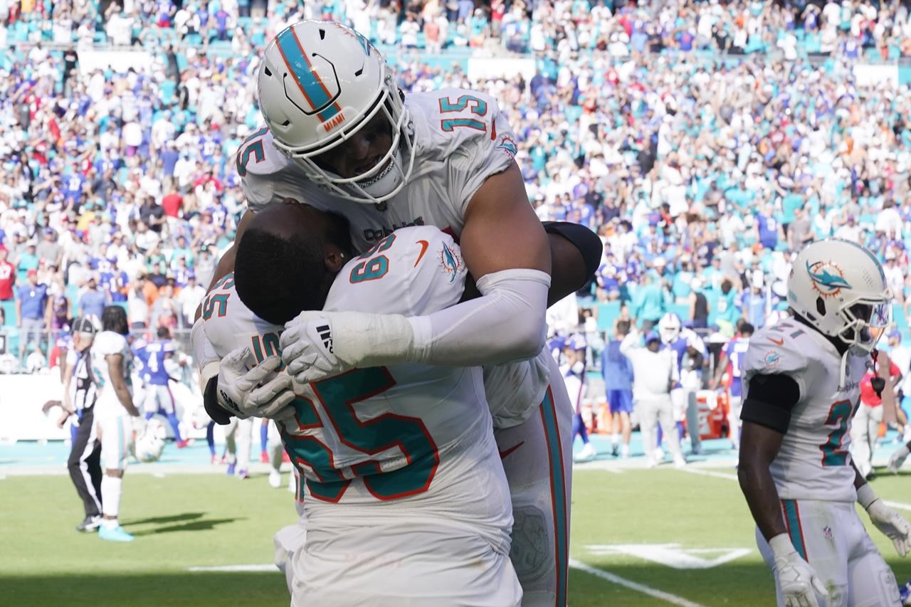 Le linebacker Jaelan Phillips (15) et le guard Robert Jones (65) des Miami Dolphins s’embrassent à la fin d’un match de football NFL contre les Buffalo Bills, dimanche 25 septembre 2022, à Miami Gardens, Fla. Les Dolphins ont battu les Bills 21-19.